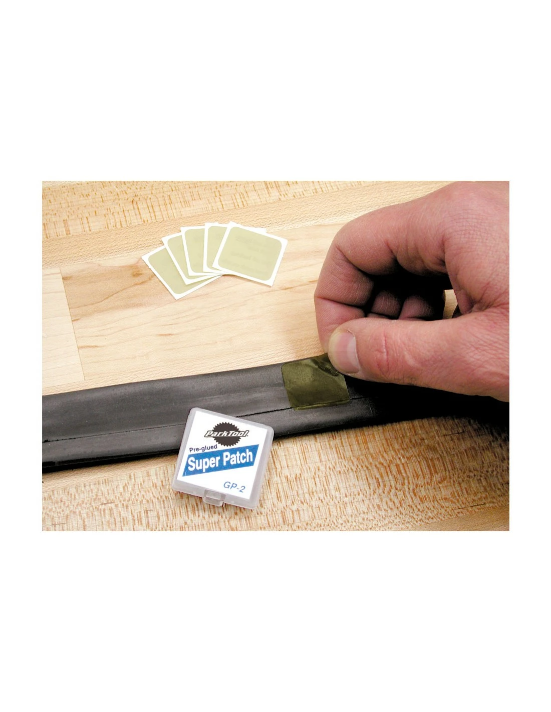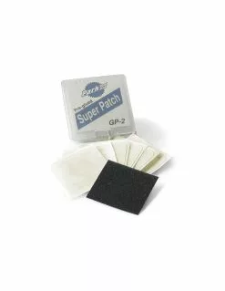 Viene en una caja ligera que contiene seis parches y una lija.